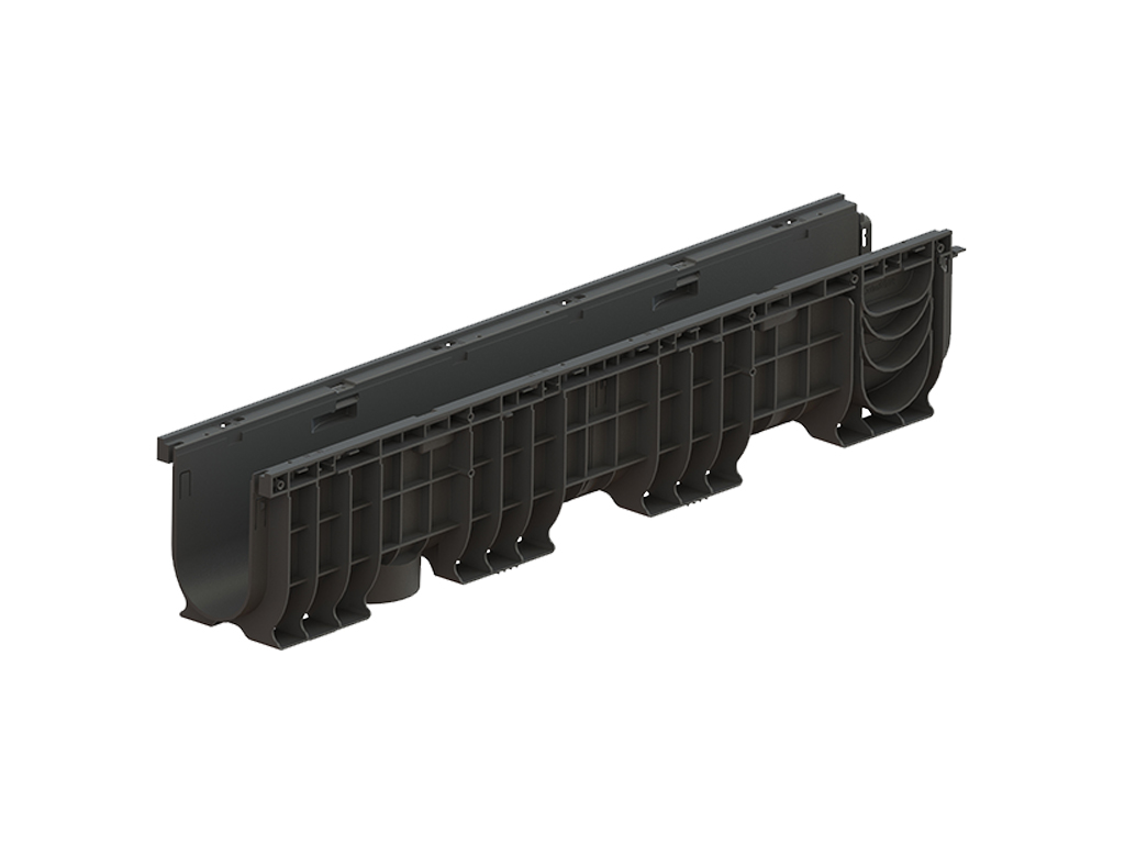 Rigola pluviala PolyMax Basic DN100 H200, fără gratar pluvial, fabricată din polipropilenă. Această rigolă se poate dotă cu toate tipurile de grătare (gratar din fontă, gratar din oțel zincat, gratar din oțel inoxidabil, gratar din plastic, gratar din cupru sau capac din oțel zincat) din seria Basic DN100, care sunt și de diferită clasa de sarcini A15 (15 kN), B125 (125 kN) sau C250 (250 kN) în conformitate cu standardul EN 1433.