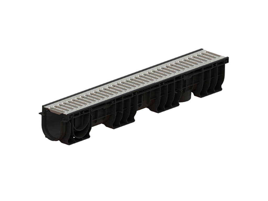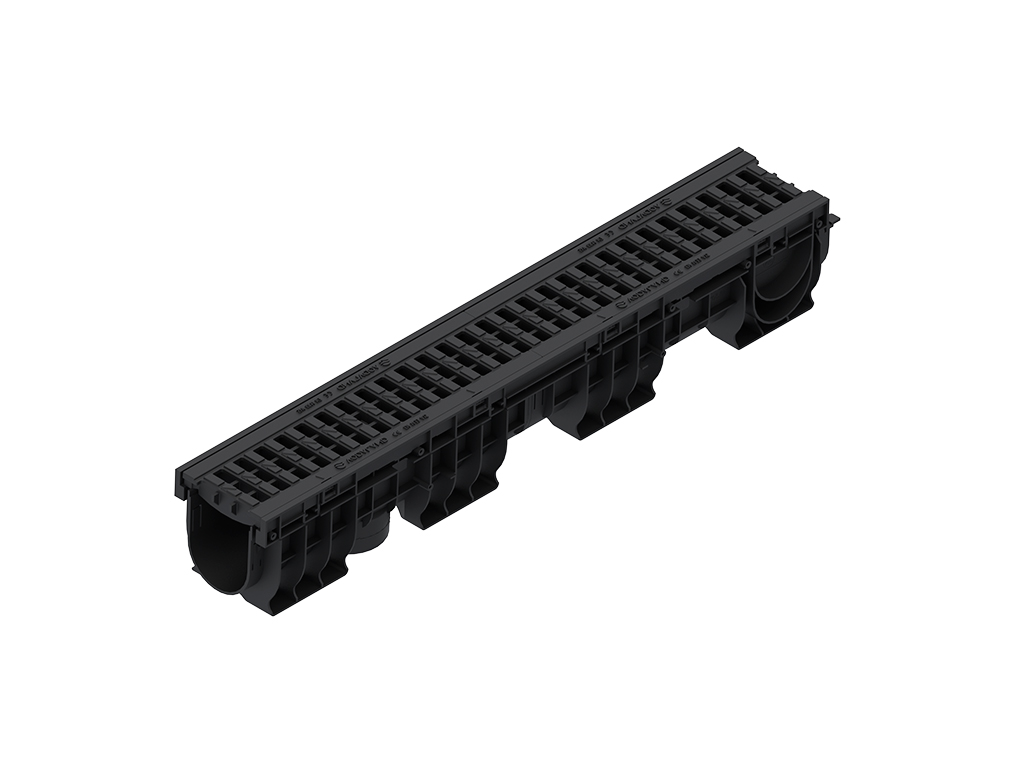 Модернизированный лоток Base DN100, изготовлен из прочного пластика с высотой 165 мм, оснащен решётками из полиамида усиленными стекловолокном (PA-GF), предназначен для установки в пешеходных зонах класс нагрузки А15, согласно EN 1433.